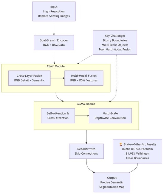 - The CLMF module uses a two-stage fusion strategy to effectively preserve spatial details and suppress DSM noise. The MSMA module innovatively incorporates multi-scale depthwise separable convolutions into the attention block, which significantly boosts the model’s ability to perceive and segment ground objects of vastly different sizes.