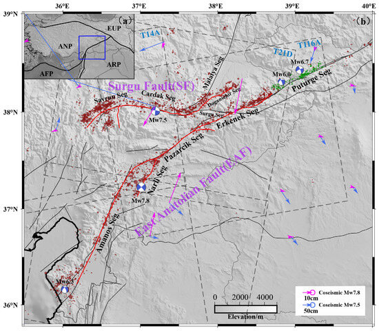 On 6 February 2023, an earthquake doublet of Mw 7.8 and Mw 7.5 occurred along the East Anatolian Fault (EAF) and the nearby Surgu fault (SF) zones in Turkey (Figure 1), resulting in over 50,000 fatalities and 100,000 injuries [1]. The EAF is a major fault formed by interaction between the Anatolian subplate, the African plate, and the Arabian plate [2]. The slip rate of the EAF zone is about 10 mm/year in the northeastern segments (Puturge) and 4.5 mm/year in the southwestern segment (Amanos), indicating interseismic strain accumulation in the central (the Pazarcik and Erkenek) segment [3]. Historically large earthquakes associated with the EAF zone mainly occurred before the 20th century, and there was a seismic gap with sparse seismicity over the past 200 years [4].