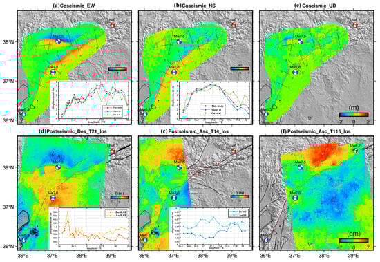 Analysis of the coseismic and postseismic deformation field and fault profile. The red lines represent EAF and SF, the blue beach ball represents the focal mechanism solution of the 2023 Turkey earthquake doublet. Panels (a–c) show the coseismic deformation field in the east–west, north–south, and up–down directions, Grey lines represent profiles. Panels (d–f) show the LOS deformation field of T21, T14, and T116 after the 2023 earthquake doublet. The subfigures at the lower right corner in panels (a,b) represent the relative sliding along EAF and SF in the horizontal plane. Red, blue, and green lines indicate the different results with the same way to calculate using the deformation field from this study and the previous study [18,19]. The subfigures at the lower right corner in panels d and e represent the relative sliding from ascending (light color) and descending (dark color) along EAF and SF.