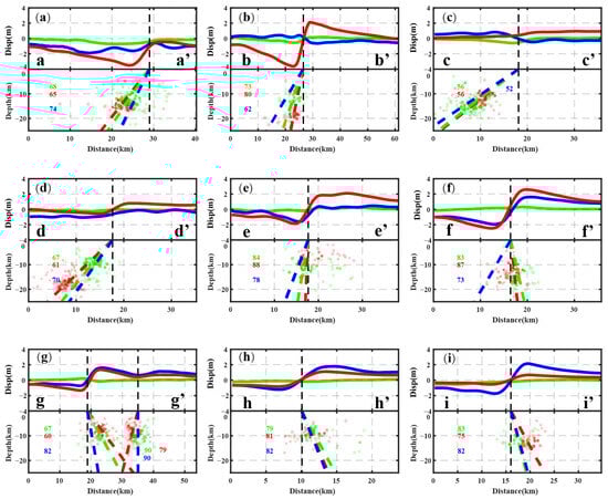 Profile of the 2023 earthquake doublet: coseismic deformation and aftershocks. In subfigures, red, blue, and green solid lines represent the profile value of the coseismic deformation in east–west, north–south, and up–down directions. Red and green dashed lines represent dip angle by aftershocks, which are from this study (red dot), relocated 3707 earthquakes of Mw > 3.0 within 5 months following the Mw 7.8 event [4], and other studies (green dot) relocated 2909 earthquakes of Mw > 3.0 within the first 11 days [6], respectively. Blue dashed lines represent dip angle calculated by coseismic InSAR field [18]. The letters represent the name of the profile and the locations of profiles are indicated in Figure 2. Subfigures (a), (b), and (c) correspond to profiles aa′, bb′, and cc′ on the SF, respectively. Subfigures (d–i) correspond to profiles dd′, ee′, ff′, gg′, hh′, and ii′ on the EAF, respectively.