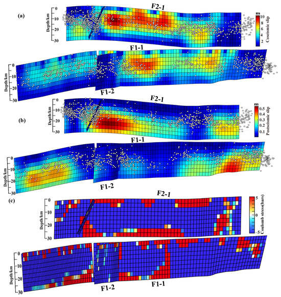 Coseismic and postseismic slip distribution and coseismic Coulomb stress changes in the 2023 Turkey earthquake doublet; (a,b) show the slip distributions of the coseismic and postseismic ruptures of the 2023 earthquake doublet, respectively. The white dots indicate the aftershocks of Mw > 3 within 5 months following the earthquake doublet [4]; (c) shows the coseismic Coulomb stress changes on the fault plane.