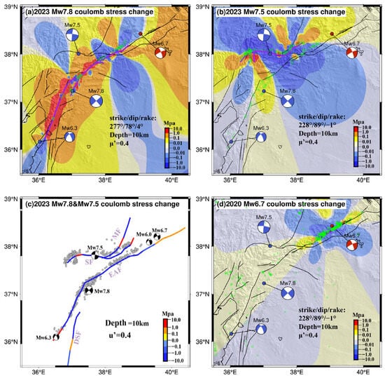 It is worth noting that a gap in the coseismic rupture area between the 2023 earthquake doublet and the 2020 Mw 6.7 earthquake [5], and the mutual influence of coseismic stress among them is still unclear. Therefore, we used Coulomb 3.4 software to calculate the coseismic Coulomb stress changes in four conditions: Mw 7.8, Mw 7.5, earthquake doublet, and the 2020 Mw 6.7 earthquakes. According to the 2023 earthquake doublet source mechanism solution, the receiver fault parameters were set to the same torque tensor (strike = 277°, dip = 78°, rake = 4°) as the Mw 7.5 earthquake (Figure 5a) and the same torque tensor (strike = 228°, dip = 89°, rake = −1°) as the Mw 7.8 earthquake (Figure 5b,d). The others are set to the parameter characteristics corresponding to the faults (Figure 5c). Since the influence of different effective friction coefficients on the calculated coseismic Coulomb stress change was not significant (Figure S9), we adopted a value of 0.4, following previous studies [16].