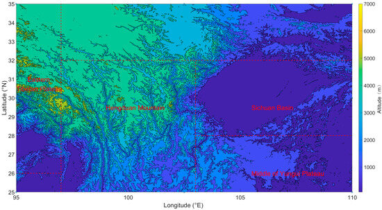 The region of interest selected in the study: Eastern Tibetan Plateau (95–97°E, 26–35°N), Hengduan Mountain (97–103°E, 25–32°N), Sichuan Basin (103–110°E, 28–32°N), Middle of Yungui Plateau (103–110°E, 25–28°N). The boundaries of the individual areas are marked by a red dashed line.