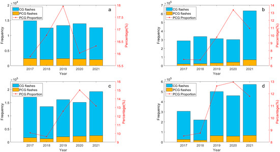 The annual distribution of CG and PCG lightning frequency (y-axis on the left) and the proportion of PCG lightning flashes (y-axis on the right) in the Hengduan Mountains and its surrounding areas from 2017 to 2021: (a) Eastern Tibetan Plateau, (b) Sichuan Basin, (c) Hengduan Mountain, (d) Middle of Yungui Plateau.