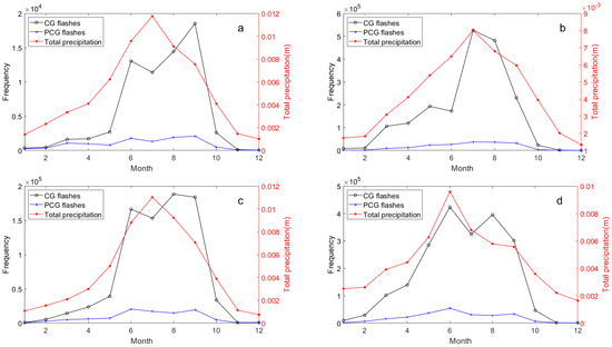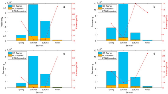 The seasonal distribution of CG and PCG lightning frequency (y-axis on the left) and the proportion of PCG lightning flashes (y-axis on the right) in the Hengduan Mountains and its surrounding areas from 2017 to 2021: (a) Eastern Tibetan Plateau, (b) Sichuan Basin, (c) Hengduan Mountain, (d) Middle of Yungui Plateau.