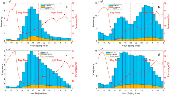 The diurnal variation of CG and PCG lightning frequency (y-axis on the left) and the proportion of PCG lightning flashes (y-axis on the right) in the Hengduan Mountains and its surrounding areas from 2017 to 2021: (a) Eastern Tibetan Plateau, (b) Sichuan Basin, (c) Hengduan Mountain, (d) Middle of Yungui Plateau (The red dotted line represents the boundary between day time and night time).
