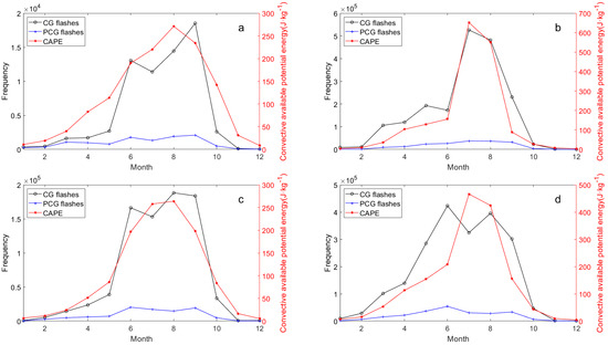 As in Figure 6, but for CAPE: (a) Eastern Tibetan Plateau, (b) Sichuan Basin, (c) Hengduan Mountain, (d) Middle of Yungui Plateau.