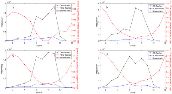 A high Bowen ratio, typically associated with drier land surfaces, favors the development of a deep, hot, and dry boundary layer. This subsequently leads to higher cloud base heights. These elevated cloud bases, in turn, can reduce the entrainment of dry environmental air into a rising convective plume, allowing for a more efficient conversion of CAPE into strong updrafts. Such robust updrafts are critical for efficient non-inductive charging processes that drive lightning production [23,50,51]. Our finding, while seemingly counterintuitive to the theory that high Bowen ratios can increase lightning efficiency, must be interpreted within the climatological context of our study region. The negative correlation likely arises because the seasons with the highest lightning frequency (i.e., the summer monsoon season) are precisely when the study region experiences maximum moisture availability and rainfall. During this period, a large fraction of the surface energy is partitioned into latent heat flux for evaporation, leading to a low Bowen ratio. Conversely, drier seasons with less lightning are characterized by higher Bowen ratios. Therefore, on a monthly climatological scale, the overwhelming signal of the summer monsoon—which brings both abundant moisture (lowering the Bowen ratio) and the necessary conditions for widespread, frequent thunderstorms—drives this negative statistical relationship. This does not contradict the underlying physics but rather highlights that on a seasonal scale, moisture availability is probably the dominant climatological driver that co-varies with both lightning frequency and the Bowen ratio in this region.