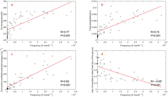 The correlations between monthly CG lightning frequency in the Hengduan Mountains and its surrounding areas from 2017 to 2021 and the selected meteorological elements at the corresponding time and region: (a) 2 m temperature, (b) Total precipitation, (c) CAPE (d) Bowen ratio (The ratio of sensible heat flux to latent heat flux). R represents the value of correlation coefficient and P shows the significance level.