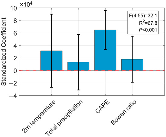 The results are visualized in the coefficient plot (Figure 11). The overall model was highly significant (F(4,55) = 32.1, p < 0.001) and explained 67.8% of the variance in lightning frequency (Adjusted R2 = 0.678). The plot clearly shows that CAPE is the only statistically significant independent predictor; its coefficient is positive, and its 95% confidence interval does not cross zero. In contrast, the confidence intervals for 2 m temperature, precipitation, and the Bowen ratio all overlap with zero, indicating that their effects are not statistically significant after controlling for the other variables. This comprehensive analysis robustly confirms that, on a climatological monthly scale in our study region, CAPE is the most critical and overwhelmingly dominant driver of lightning activity.