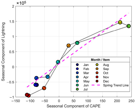 To quantitatively describe this process, we calculated two key metrics. First, given that the hysteresis loop exhibits a self-intersecting ‘figure-8’ shape, which contains two sub-loops with opposite traversal directions, we calculated its net area. This value, representing the algebraic sum of the signed areas of these sub-loops (one positive, one negative), was found to be 507,331.46. Second, using the spring (Mar-May) trend line as a “baseline response” (Figure 12, purple dashed line) to measure the summer deviation, we found that lightning activity in July and August fell 42,650.72 and 9864.35 units below the baseline expectation, respectively. Notably, although lightning activity is still increasing from July to August (the response lag), its absolute level remains far below the theoretical value predicted by the CAPE-lightning relationship of the spring “developmental phase.” This suggests that the lag effect and a concurrent suppression mechanism together create the complete picture of the “summer anomaly.”