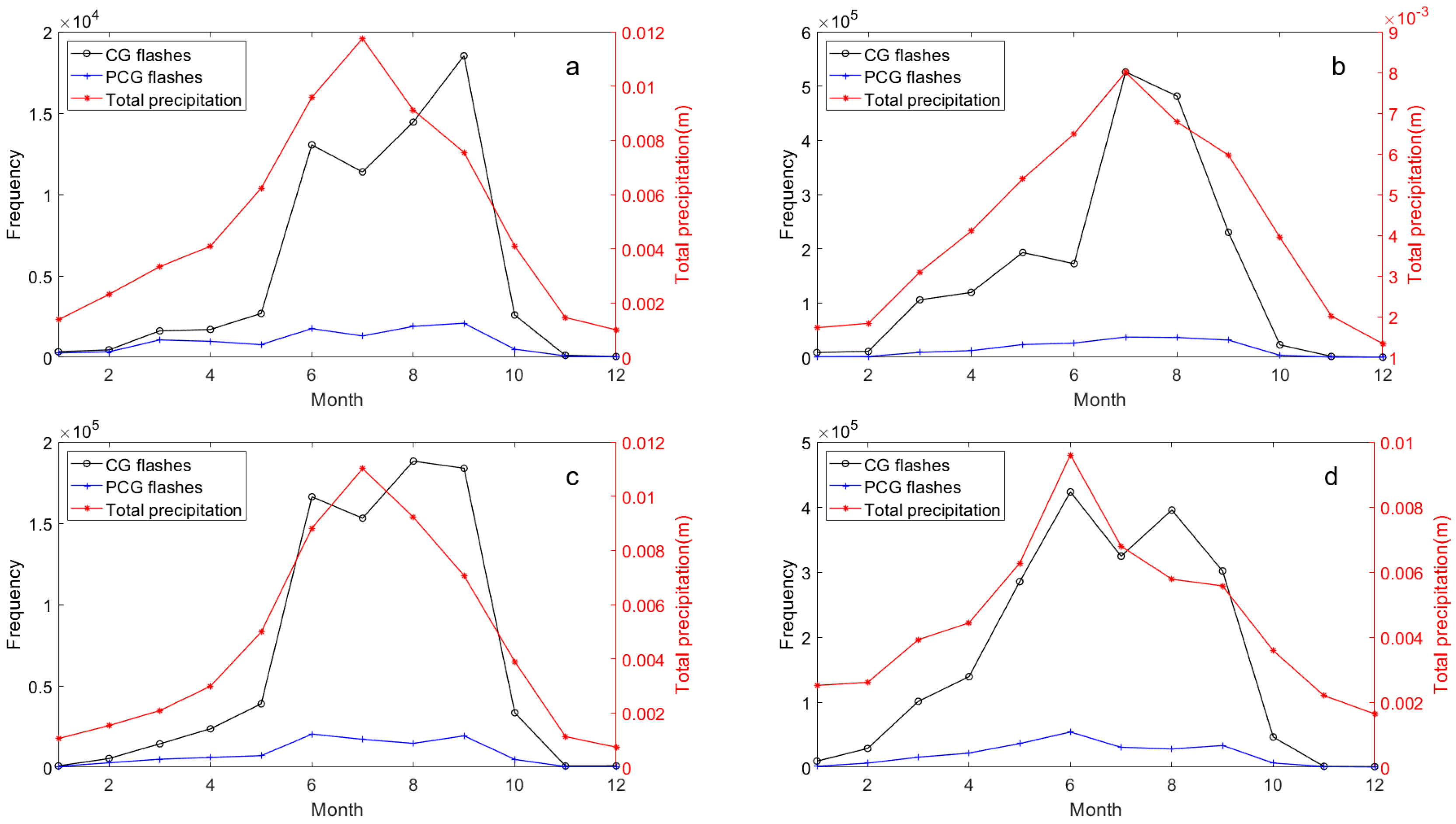 - Qie, K.; Qie, X.; Tian, W. Increasing trend of lightning activity in the South Asia region. Sci. Bull. 2021, 66, 78–84. [Google Scholar] [CrossRef] [PubMed]