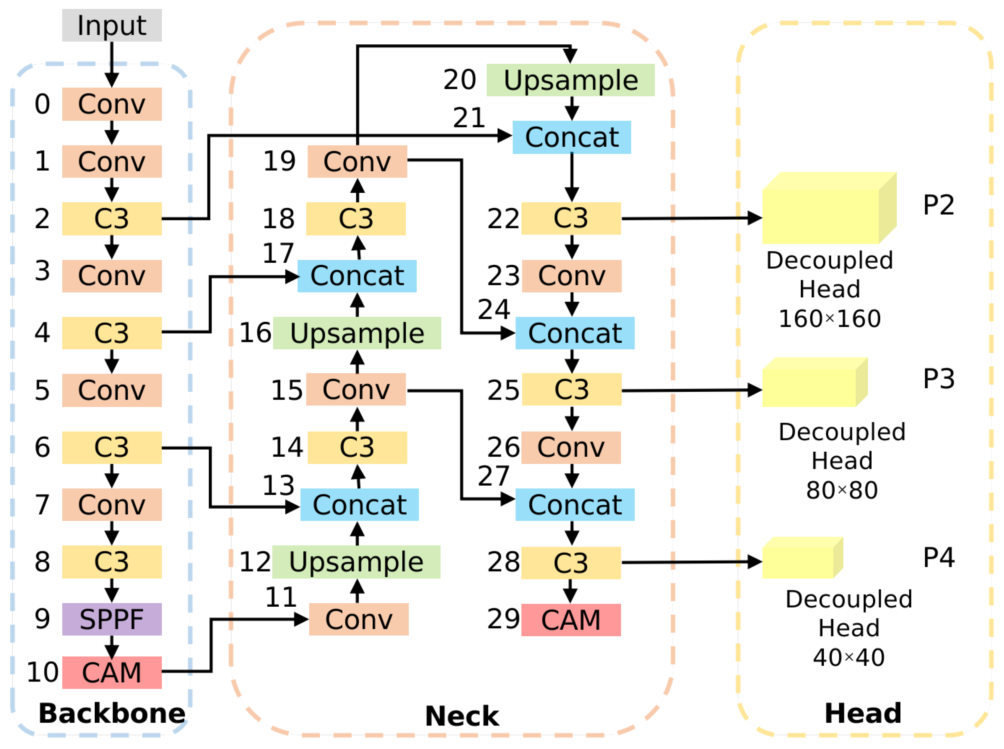 We designed a structural optimization scheme for detection heads tailored to the drone’s perspective, achieving a synergistic improvement in accuracy and efficiency. Rather than simply increasing the number of detection heads, we implemented a targeted architectural reorganization based on the distribution of object scales in drone imagery. We introduced a high-resolution P2 detection head to capture the fine features of tiny objects (down to pixels), while simultaneously removing the redundant P5 detection head for low-altitude targets. This "both increasing and decreasing" strategy not only expanded the detection capability for extremely small objects but also reduced the total number of model parameters by approximately 30%, demonstrating significant system-level optimization advantages.