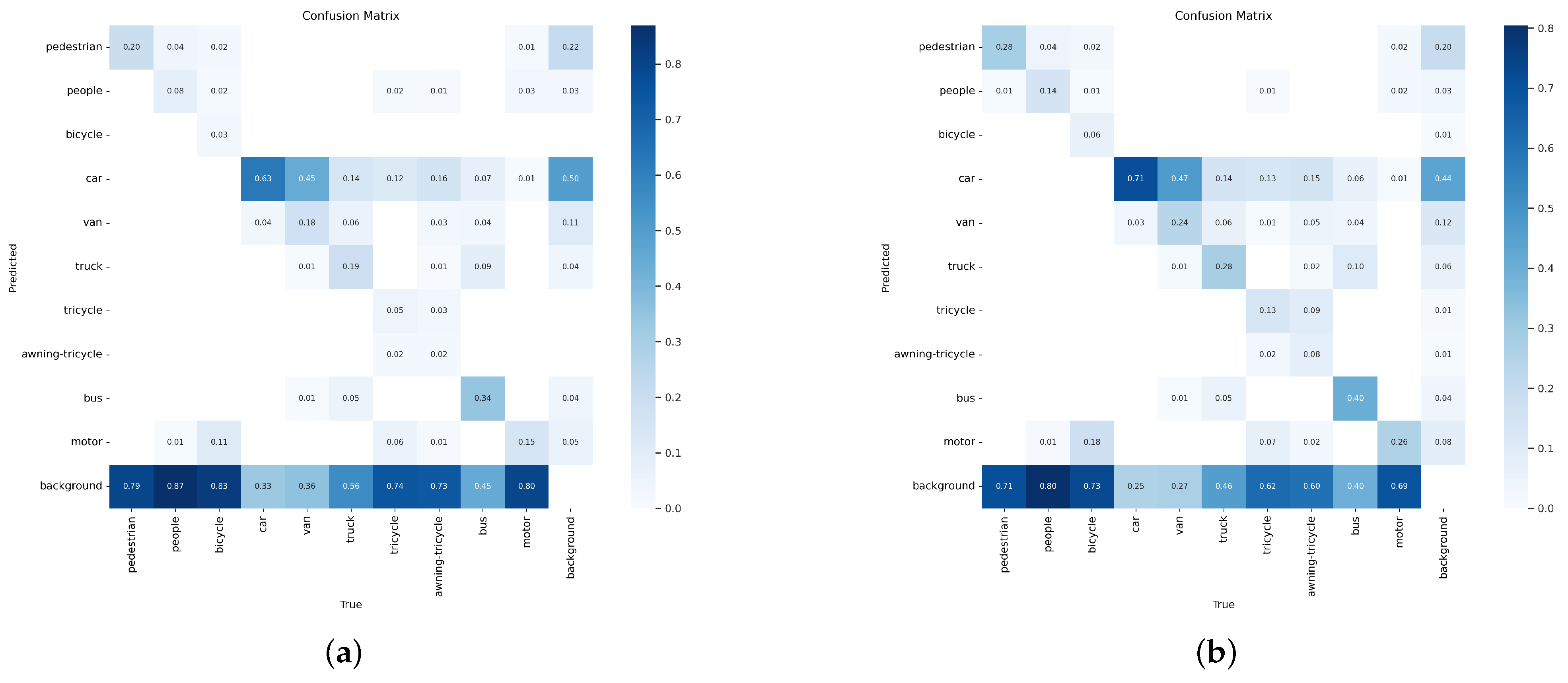 Figure 7. This evaluation methodology provides granular insights into per-class prediction accuracy and error distribution. As shown in the confusion matrix, our model achieves high recall and precision for prevalent classes like people and car. However, performance is lower for classes with fewer instances and those that are visually similar, such as awining-tricycle being occasionally misclassified as tricycle due to their morphological resemblance. This analysis confirms that the overall mAP is primarily limited by the long-tail distribution of the dataset and inter-class similarity, rather than a universal failure mode.