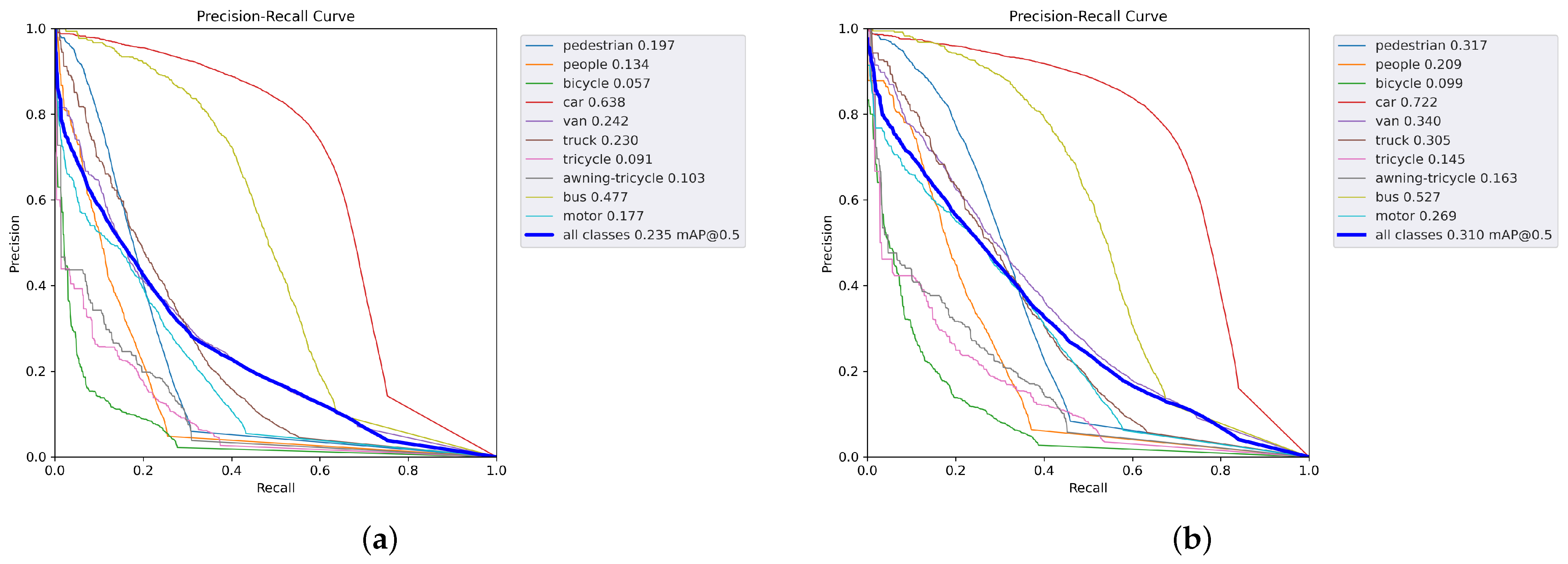 Figure 9, reveals the proposed algorithm’s superior performance across all object categories, with particularly notable gains in pedestrian detection where precision-recall metrics advanced from 19.7% to 31.7%. This 60.9% relative improvement underscores the architecture’s enhanced capability in small-object discrimination and dense-scene analysis, attributable to its refined feature extraction mechanisms and contextual modeling. The observed simultaneous elevation of both precision and recall metrics signifies substantial reduction in both false negatives and false positives—critical for applications demanding high-fidelity detection under operational constraints. These advancements establish a new performance benchmark for UAV-based visual perception systems where reliable identification of sub-pixel targets in cluttered environments remains paramount for industrial deployment in precision surveillance, automated inspection, and critical infrastructure monitoring.