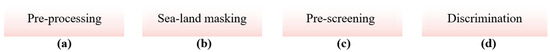 Before the rise of deep learning, sea–land segmentation was widely employed for SAR ship detection [50]. Figure 2 illustrates the typical processing steps commonly employed in traditional SAR ship detection methods. It mainly consists of four steps [56]: (a) pre-processing, (b) sea–land masking, (c) pre-screening and (d) discrimination. Specifically, pre-processing is used to calibrate the source image to make further pre-screening more accurate; sea–land masking aims to generate sea–land segmentation mask, ensuring that detection targets focus solely on the sea region. Pre-screening adapts Constant False Alarm Rate (CFAR) detector to detect ships; discrimination is used to further refine the detection results and reject possible false alarms. In sea–land masking, there are two kinds of mainstream methods. The first type of method derives sea–land information directly from images, utilizing algorithms such as adaptive threshold segmentation, region growing, and morphological processing [55] to create coarse sea–land segmentation mask. The second type of method leverages data such as coastline database and geometrically aligns it with the SAR image, to extract the precise boundary between sea and land, ultimately generating sea–land segmentation mask which facilitates the following pre-screening to prevent false alarms. This kind of method is adopted and integrated in most mature software [49,50] in real applications.