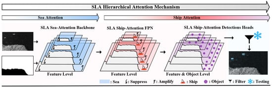 To direct the network’s attention to valuable regions, we propose the SLA Hierarchical Attention mechanism that gradually focuses the network’s attention on sea and ship regions in a coarse-to-fine-grained manner. As far as we know, it is the first attention mechanism guided by sea–land priors in SAR ship detection. To instantiate the mechanism, SLA Sea-Attention Backbone, SLA Ship-Attention FPN, and SLA Ship-Attention Detection Heads are proposed, collectively constituting SLA-Net, enabling a Hierarchical Attention process that progresses from coarse sea attention to fine-grained ship attention.