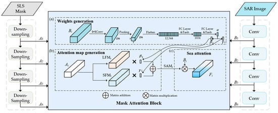 The core idea of SLA Sea-Attention Backbone is to instantiate sea attention and enable the neural network to be fully aware of sea regions by leveraging the sea–land segmentation masks (SLS masks). Specifically, SLA Sea-Attention Backbone uses SLS masks to enhance the spatial attention of the network to sea regions (where ships are probably situated) while reducing the attention to land regions. Figure 4 illustrates the implementation process of SLA Sea-Attention Backbone. On the left side of Figure 4 is a flowchart showing the input of SLS masks into the network, while the right side presents a flowchart of raw SAR images being fed into the network. The results of their respective processing (i.e., feature map Bi and feature map mask Ai) are then fed into the corresponding Mask Attention Block (MA-Block). Specifically, after both SAR images and SLS masks are input into the network, the SAR images undergo feature extraction via ResNet50 [62], generating the corresponding four feature maps (B1 to B4) of different resolution. Meanwhile, the SLS masks are processed through four pooling layers, with each layer employing bilinear interpolation-based down-sampling to dynamically resize SLS masks, which ensures precise spatial alignment between feature map Bi and corresponding feature map mask Ai.