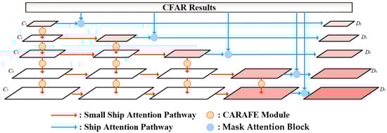 In the SA Path, we used SLS masks to exclude land area in original SAR images and conduct the CFAR algorithm on the masked images. Like the SLS mask used in Mask Attention Block in Section 3.1, CFAR results are treated as the inherent source of ship attention map, where 0 in CFAR results denote background and 255 denotes ship. By simply down-sampling CFAR results to align with the size of the feature map in FPN and sending the resized results to Mask Attention Block which is also used in Backbone to conduct spatial attention, SLA Ship-Attention Backbone leads to fine-grained spatial attention of ship location for the network. Notably, in this paper, we simply choose classic CA-CFAR [65] as the CFAR algorithm. Moreover, it is worth noting that sea–land segmentation information serves as the cornerstone of ship attention—this is because CFAR only needs to be performed over maritime regions for preventing unnecessary land false alarms, as previously noted in Section 2.1.