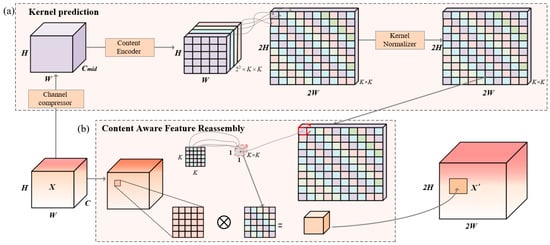 Then, the feature map passes through the Content Encoder, which consists of a stack of convolutional layers (supplemented by ReLU and normalization) to encode the content of input features. This process generates a position-specific reassembly kernel for adaptive up-sampling at each spatial location. In this context, we set the kernel channel width to 22 × k × k, where the factor of 22 corresponds to the 2× up-sampling operation. The parameter k determines the range of neighborhoods considered at each up-sampling position. Then, the reassembly kernels are reshaped to a 2L × 2L × (k × k) dimension. Finally, each reassembly kernel is normalized with the Kernel Normalizer.