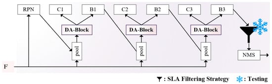 The core idea of SLA Ship-Attention Detection Heads is to further instantiate ship attention in SLA Hierarchical Attention mechanism. Figure 7 illustrates the cascaded detection framework [61] of SLA Ship-Attention Detection Heads, which integrates two key innovations: the Double Attention Block (DA-Block) and the Sea–Land Aware Filtering strategy. From left to right, the data flow starts with the feature map F from SLA Ship-Attention FPN, where the Region Proposal Network (RPN) generates candidate ship regions. These regions undergo ROI Pooling to extract normalized features, which are then fed into the DA-Block, inserted before the cascaded classification heads (C1–C3) and bounding box regression heads (B1–B3) to enhance ship-specific features. After cascade refinement, predicted bounding boxes pass through the Sea–Land Aware Filtering (represented by the funnel symbol) to eliminate land-based false positives using sea–land segmentation information. Finally, Non-Maximum Suppression (NMS) removes redundant boxes, with the snowflake symbol marking the filtering strategy that is only used in the testing phase. This design ensures that ship features are enhanced at the feature level (DA-Block) and false positives are suppressed at the post-processing stage (Sea–Land Filtering), improving both detection accuracy and efficiency.