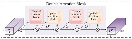 The concept of DA-Block is to utilize both spatial and channel attention twice over to enhance the essential features crucial for SAR ship detection, while effectively suppressing irrelevant ones. Figure 8 illustrates the implementation process of the Double Attention Block (DA-block). Each ROI feature, with dimensions of 7 × 7 × 256, is forwarded to two sub-blocks, namely the Channel Attention block and the Spatial Attention block [67], repeatedly. These sequential sub-blocks generate attention weights to guide the network, reinforcing attention to essential features while suppressing irrelevant or adverse ones. In summary, the above process is described by
