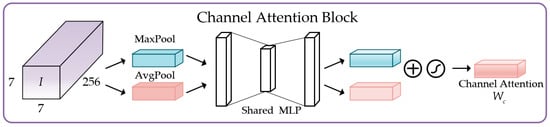 Figure 9 shows the implementation process of Channel Attention Block. The input feature is firstly sent forward to both max-pooling and average-pooling to generate two different spatial context descriptors: and , respectively. Then, these descriptors are sent to a shared network, i.e., multi-layer perceptron (MLP) with a hidden layer to produce our channel attention map . Finally, we fuse the outputs of the MLP by element-wise summation. The channel attention weight map is generated as follows: