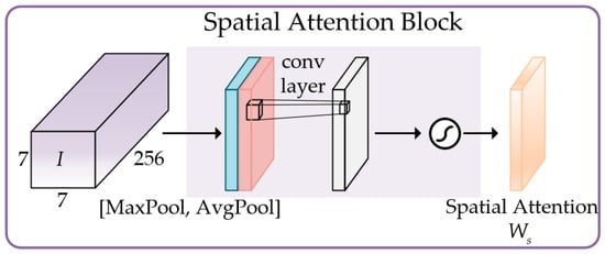 Figure 10 shows the implementation process of Spatial Attention Block. The inter-spatial relationship of features is used for generating a spatial attention map. The input feature map with dimensions of 7 × 7 × 256 is forwarded to pooling operation to generate two 1 × 7 × 7 2D maps: and . Finally, those features are concatenated and convolved by a standard convolution layer to generate a 2D spatial attention weight map . Briefly, the computation process of is as outline below: