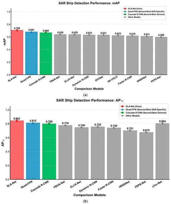 Therefore, to address the above issues, this paper proposes a novel Sea–Land Aware Network (SLA-Net). This network follows a novel Hierarchical Attention mechanism which gradually focuses the network’s attention on sea and ship regions across different stages and is instantiated by three core components: SLA Sea-Attention Backbone, SLA Ship-Attention FPN, and SLA Ship-Attention Detection Heads. These three modules leveraging sea–land segmentation information to guide the network to be aware of the differences between sea regions and land regions in feature extraction stage, feature fusion stage, and detection refinement stage, respectively, and gradually enhance the network’s attention of value regions (sea region and ship region) in a coarse-to-fine-grained manner. Since most representative methods based on SSDD adopt horizontal bounding boxes, and the primary focus of this work is on sea–land awareness rather than improvements in detection paradigms, we also employ horizontal boxes to ensure a more consistent comparison of method performance in the experiments. Furthermore, given that SLA-Net relies on sea–land segmentation information and considering the current scarcity of reliable sea–land segmentation information in the SAR ship detection community [4,51,52,53,54,55], we introduce the sea–land segmentation dataset for SSDD (SL-SSDD). SL-SSDD addresses the lack of sea–land segmentation information in deep learning-based ship detection datasets, providing a synergistic dataset for ship detection when used in conjunction with SSDD [4] and a novel perspective that is expected to inspire future research in the community working on DL-based SAR ship detection to further leverage sea–land segmentation information for enhancing SAR ship detection accuracy and exploring the synergies between SAR ship detection and sea–land segmentation.