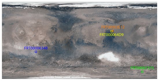 In this study, we use unprojected TER-3 images, in contrast to other sources that use map-projected MTRDR images, which are geo-referenced to the spherical surface of Mars (Viviano et al. [14]). Map-projected images result in a visually distorted appearance for the same target region; therefore, interpretation must be practised with care, often through comparison with topographic features or by using custom-coloured visualisations that assist in aligning spatial references. Refer to Figure 1 for a global map of Mars identifying the analysed target regions.
