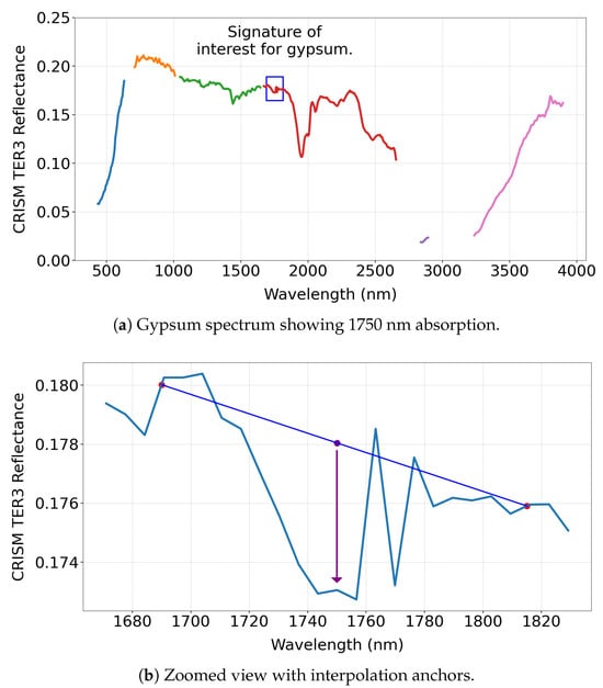- Summary product recalculation: We use Targeted Empirical Record—version 3 (TER-3) files, which enable us to recalculate summary products from the original spectral measurements. TER-3 is a specific CRISM image type [33] that consists of un-projected hyperspectral observations that have been corrected for atmospheric and photometric effects for Mars.