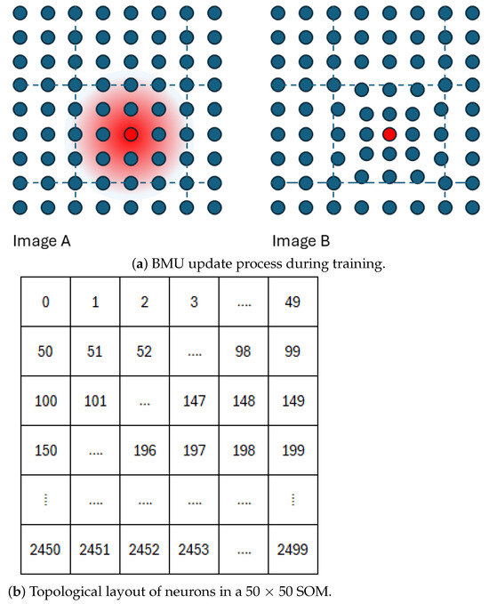 The SOM training (learning/optimisation) process is illustrated in Figure 3a. For a given input instance, the best matching neuron, also known as the Best Matching Unit (BMU), is identified based on the Euclidean distance between the input vector and each neuron’s weight vector. The neurons located within a neighbourhood radius () of the BMU are then updated based on the neurons’ distance from the BMU in the two-dimensional map grid (Figure 3a). The degree of update depends on the current learning rate and the neurons’ distance from the BMU.