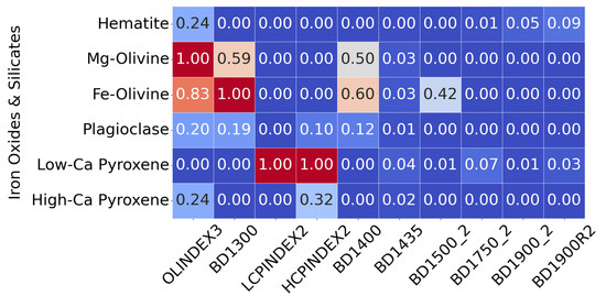 This heat map illustrates how summary products serve as input features. Rather than displaying all 29 products for each pixel, it shows a subset of recalculated summary products for selected minerals from the MRO CRISM Type Spectra Library, highlighting spectral variation across mineral types. Each horizontal row can be thought of as an individual pixel from a TER-3 image file.