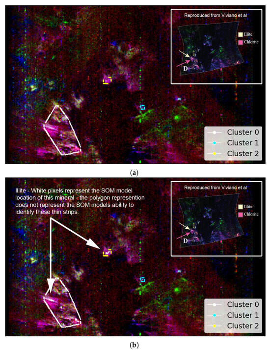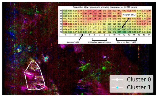 Traditional clustering algorithms such as PCA, k-means [15,34], Gaussian Mixture Models (GMMs) [13,34], and DBSCAN (Density-based clustering) have been applied to hyperspectral datasets [34,35]. However, these methods come with limitations, including the need for hyperparameter tuning and assumptions about the underlying distribution of materials. Spectral unmixing approaches such as Linear Mixing Models (LMMs) [36] offer an alternative by modelling each pixel as a linear mixture of spectra from a predefined set of end members. However, their effectiveness is limited by the linear assumption [37] and reliance on a fixed spectral library, which may not capture the substantial spectral variability experienced in practice [37,38,39]. A SOM model can mitigate some of these limitations via the preservation of topological relationships. For instance, an over-dimensionalised SOM will produce an organised map of similar neurons (refer to Section 2.3.1; a neuron can be thought of as a representative vector in this instance) that can be grouped or visually identified, meaning hyperparameter tuning is not as problematic. Similarly, topology separates high-confidence regions with more distinct mineral signatures from areas with more complex and mixed surface compositions, allowing for the identification of regions where spectral variability is not as problematic.