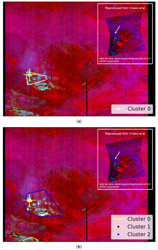 Hyperspectral remote sensing on Mars faces many of the same challenges experienced with terrestrial and lunar datasets, including issues such as size, high dimensionality, noise, atmospheric effects [17], and spatial variability of spectral signatures [11]. Additional complications include coarse spatial resolution, spectral ambiguity from overlapping or subdued absorption features, and surface contaminants such as dust cover and complex mixtures [7,13,18,19,20]. However, the absence of extensive validation data is more distinctive in the case of Mars, which makes Mars a valuable test bed for evaluating advanced data-driven methods in sparse and noise-prone environments. The scarcity of labelled data limits the effectiveness of supervised approaches and motivates the exploration of alternative strategies such as transfer learning and unsupervised methods for geospatial analysis. However, these strategies do not always generalise well to the target domain [21] and still benefit from some labelled data for fine-tuning purposes [22]. In this context, unsupervised learning—particularly clustering-based approaches—have become alternatives for hyperspectral data analysis [13].