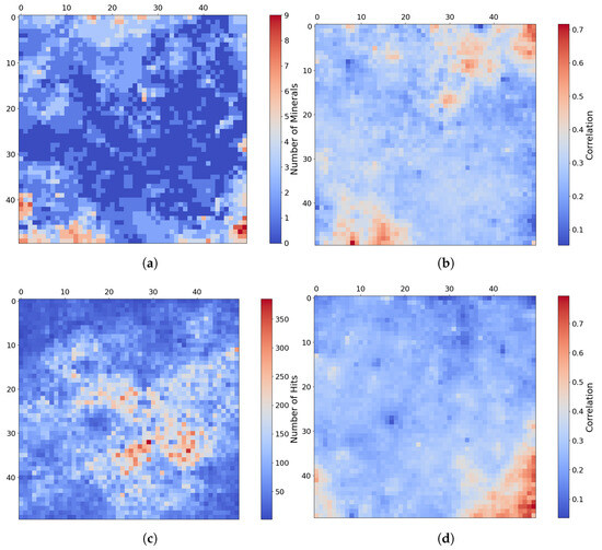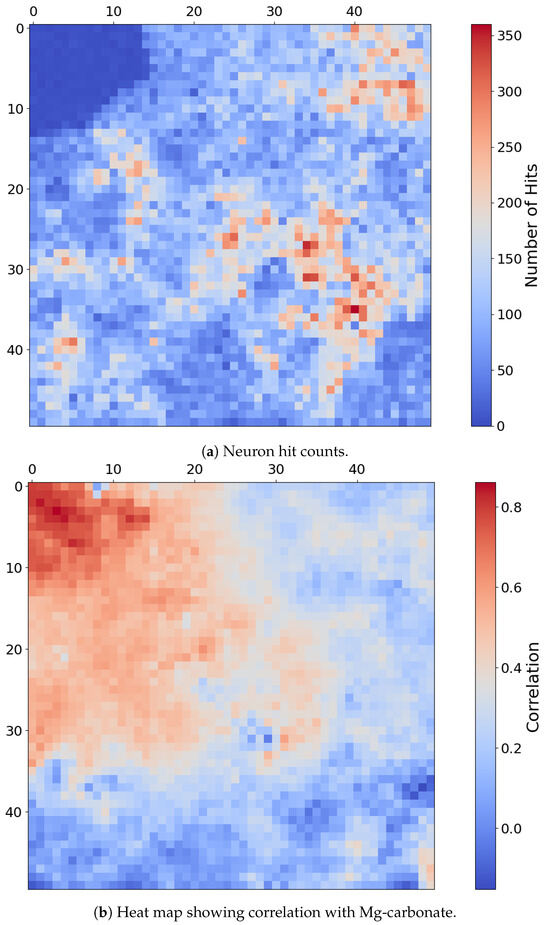The SOM model in our framework produces several outputs: pixels identified by specific neurons corresponding to particular minerals can be visualised with false-colour or RGB overlays; topological maps representing the neuron grid can be adapted to display correlations, analytical metrics such as hit rate. Furthermore, it produces group analyses that reveal mineral associations projected toward the corners of the SOM, providing insight into the model’s topological structure.