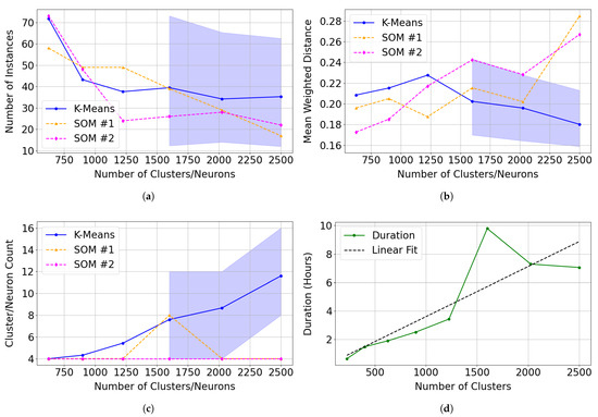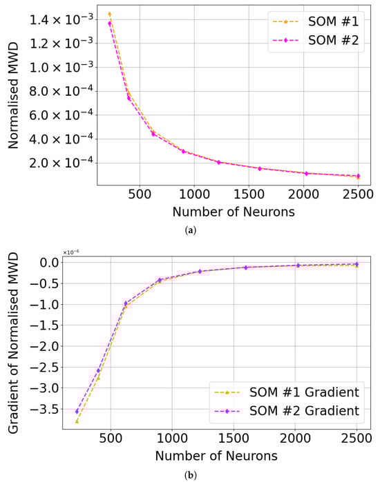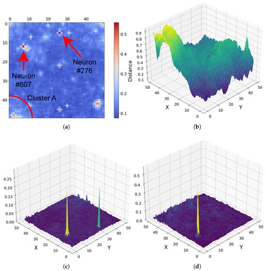 Figure 3a presents the SOM topology maps visualised as two-dimensional arrays, where each pixel corresponds to a neuron in the model. A key consideration when configuring an SOM model is determining the number of neurons. Although limited research exists on the optimal size, a commonly cited heuristic suggests using approximately neurons, where N is the number of training samples [44].