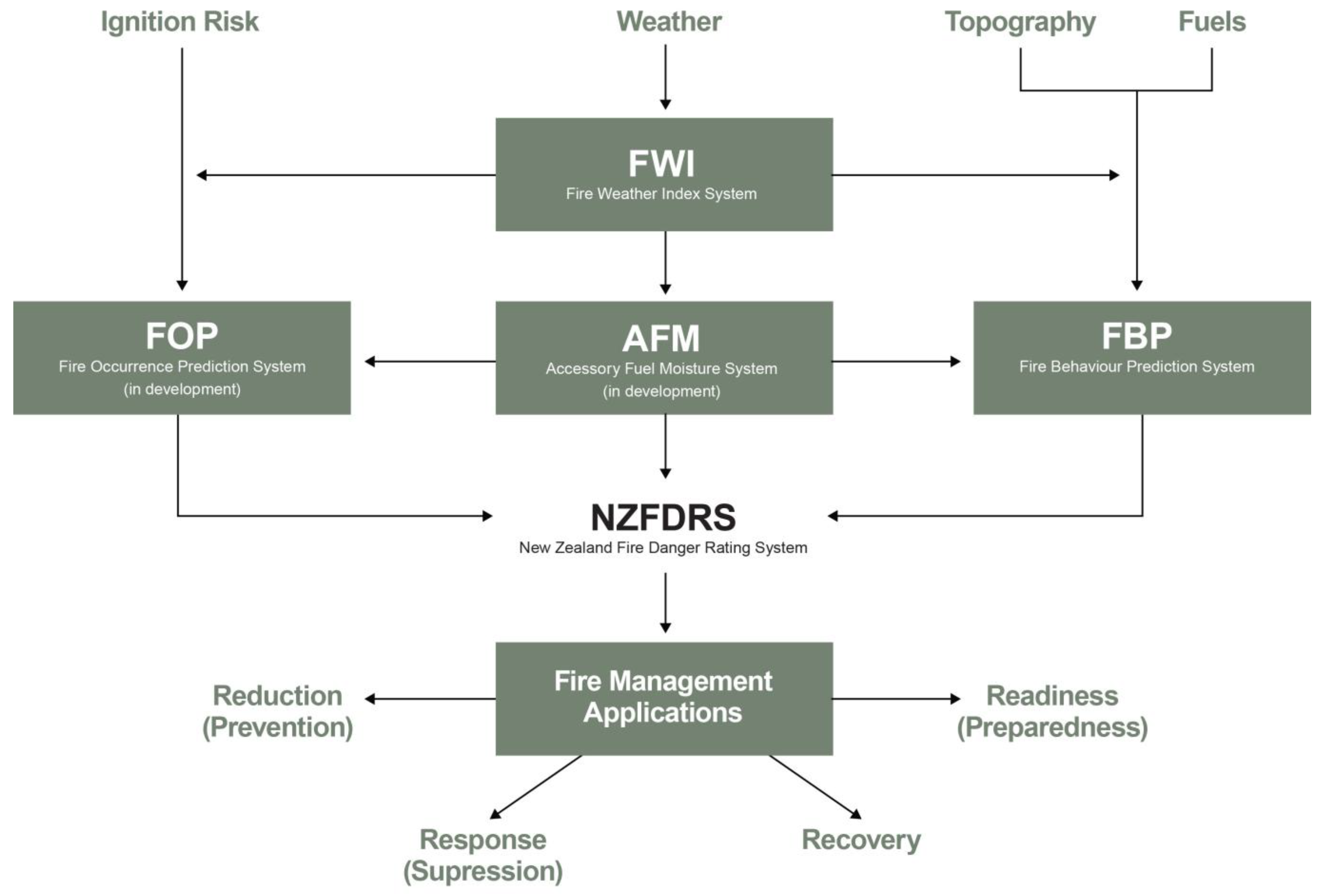 Figure 1. Structure of the New Zealand Fire Danger Rating System (NZFDRS). This is an updated image based on Anderson [28].