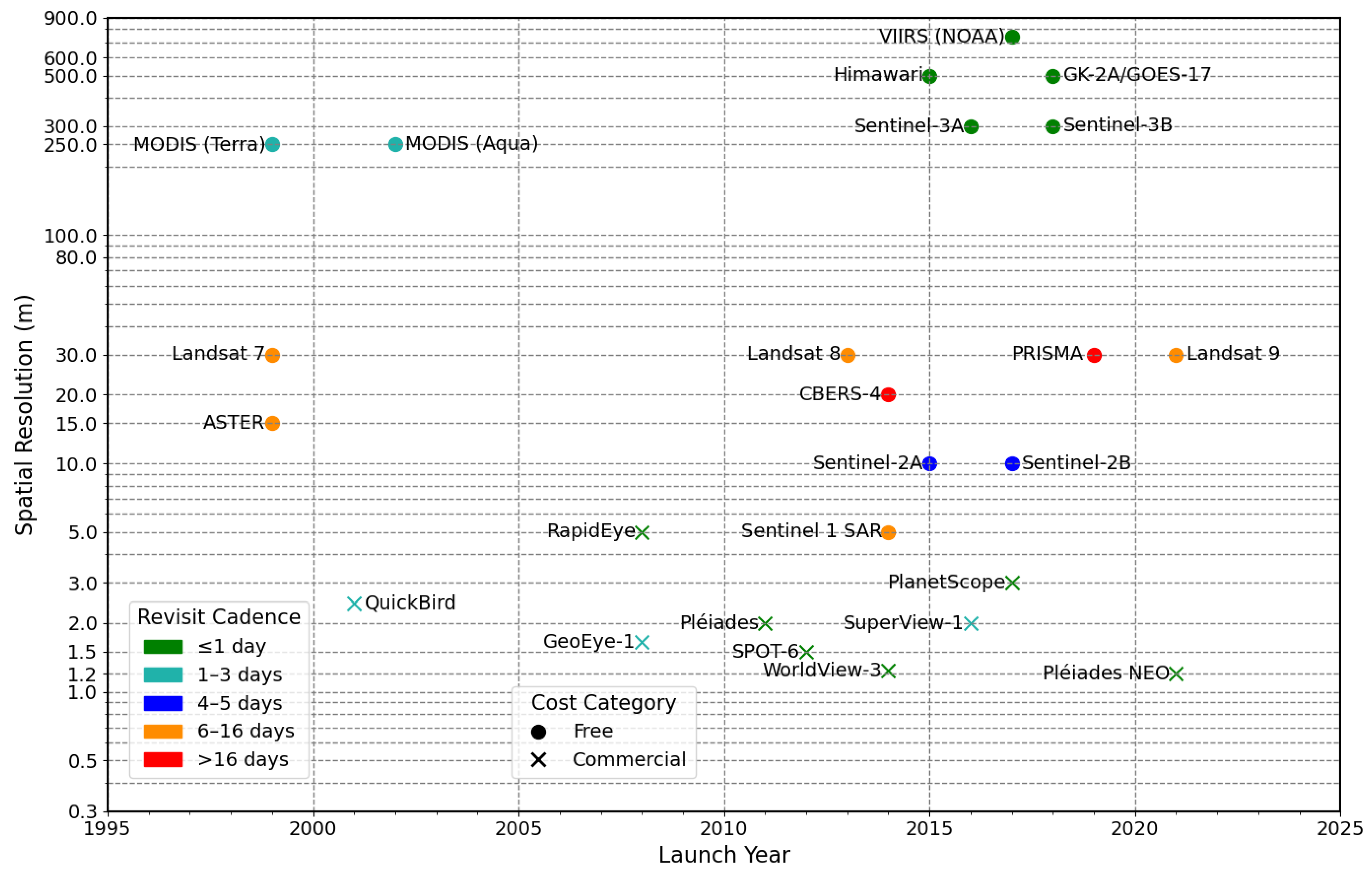 Figure 2. Variation in spatial resolution, revisit cadence and cost of selected satellites launched over the last 30 years. Spatial resolution is displayed using a logarithmic scale and is often given at the ground sampling distance (GSD) of the most fine-resolution spectral band. The revisit cadence for joint satellite constellations (e.g., Sentinel-2A and 2B) refers to the combined revisit interval achieved when both satellites operate together.