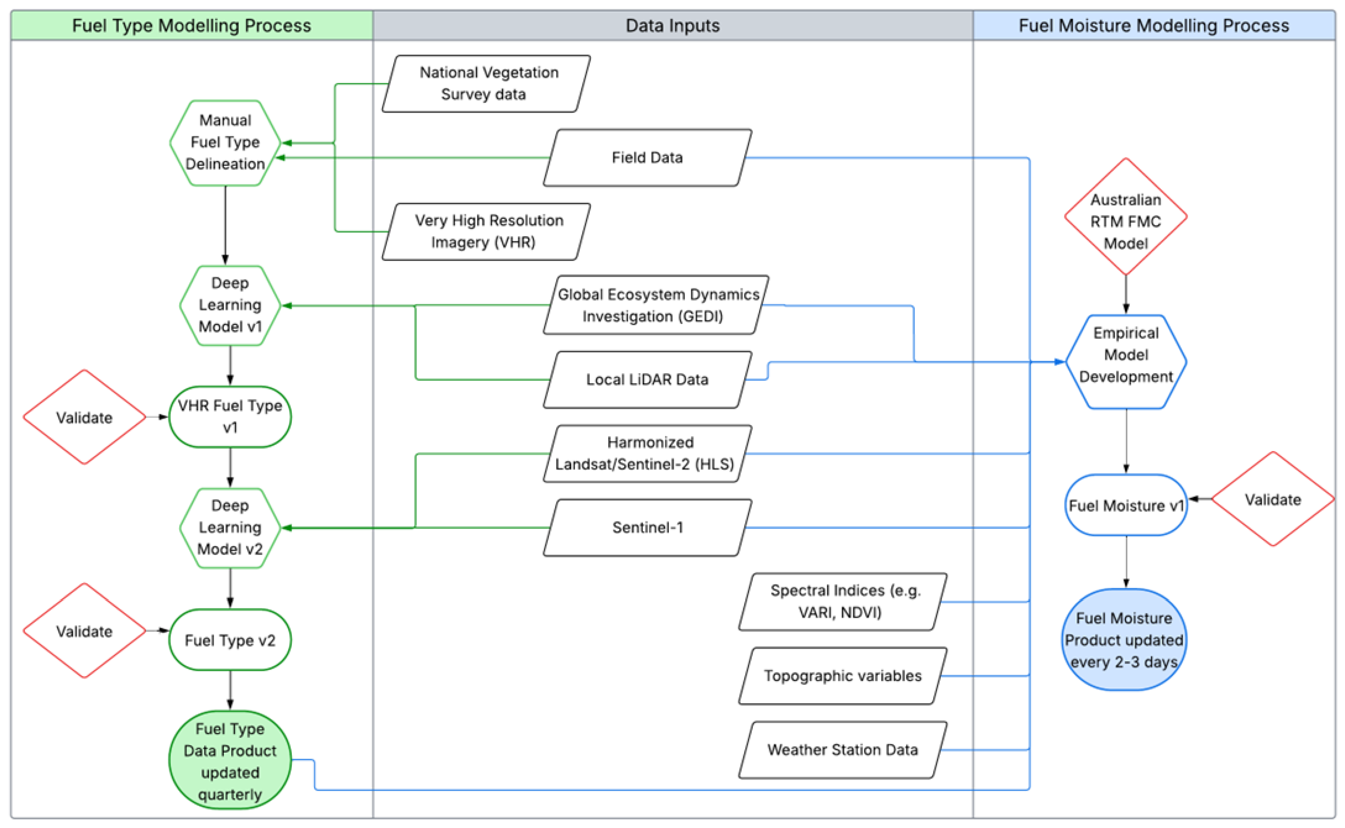 Figure 5. Process diagram to develop remotely sensed fuel type maps with quarterly updates (left) and fuel moisture maps with 2–3 day updates (right). Both products will be incorporated into wildfire assessments (Figure 4). References are given in brackets for the National Vegetation Survey data [130] and Australian RTM FMC Model [111].