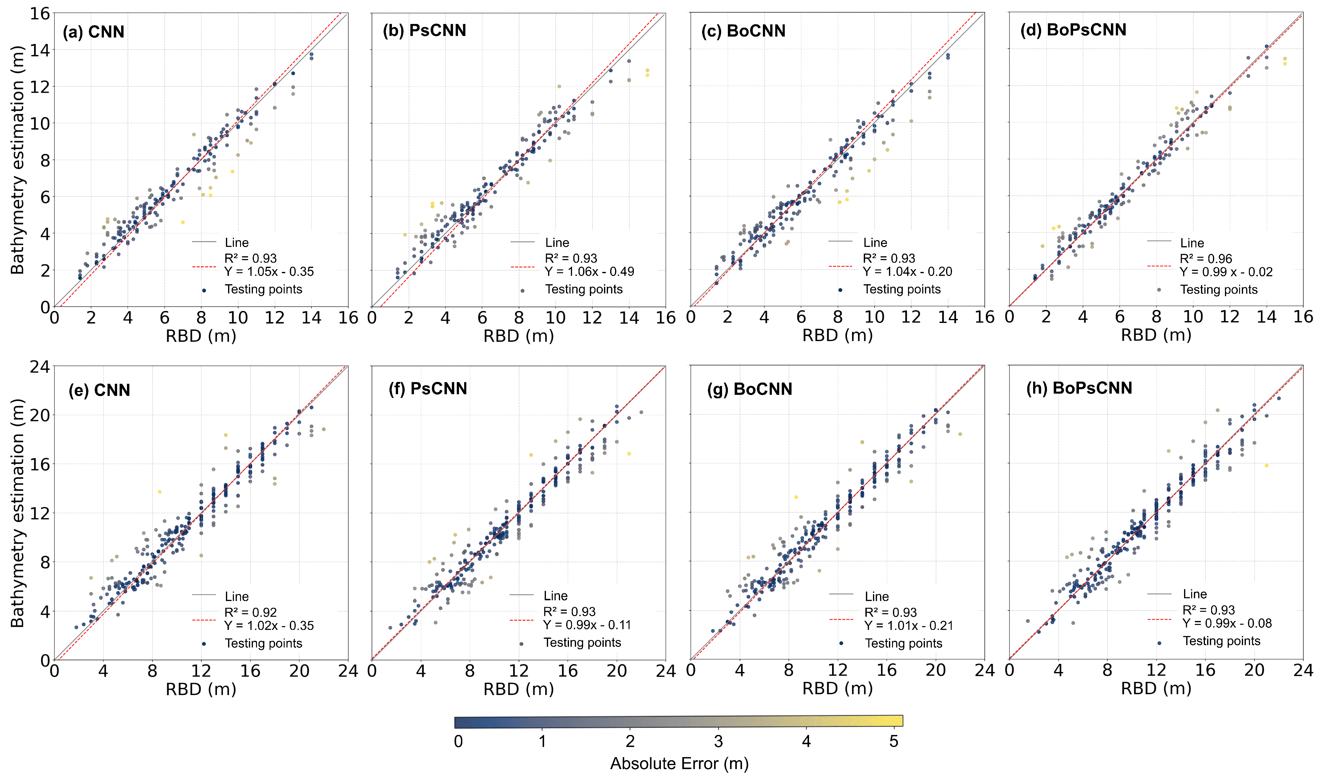 - Sun, S.; Chen, Y.; Mu, L.; Le, Y.; Zhao, H. Improving shallow water bathymetry inversion through nonlinear transformation and deep convolutional neural networks. Remote Sens. 2023, 15, 4247. [Google Scholar] [CrossRef]