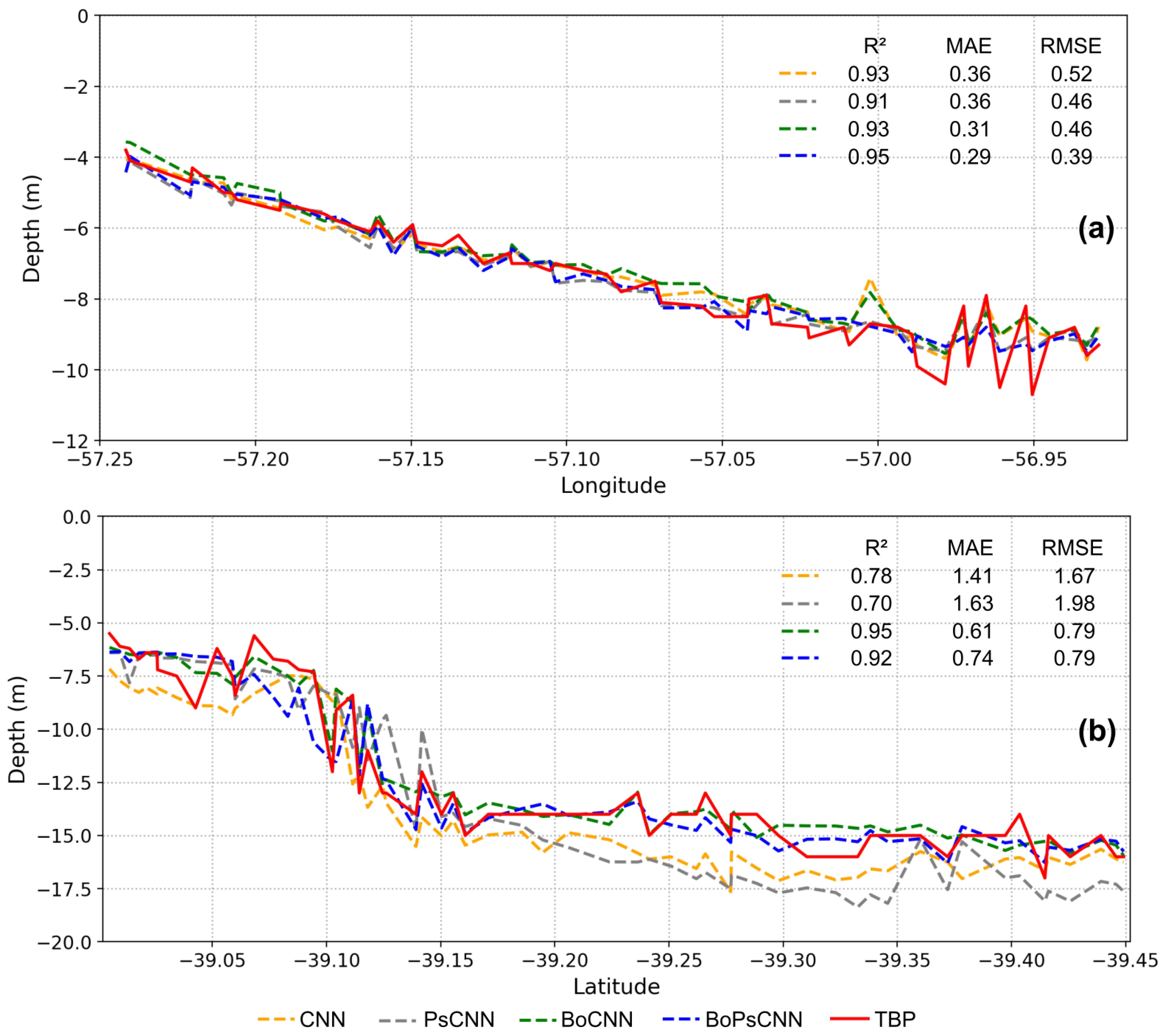 - Bathymetric maps generated by 1D-CNN models and hyperspectral images consistently reproduced the expected depth gradient from nearshore to offshore and seabed morphologies with high resolution.