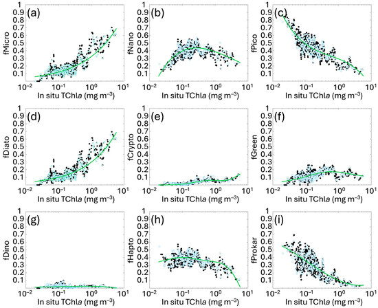 New regional relationships obtained fitting the fractions f of each size class (MICRO, NANO and PICO, panels (a–c)) and functional type (DIATO, CRYPTO, GREEN, DINO, HAPTO and PROKAR, panels (d–i)) estimated with the diagnostic pigments, against the in situ total Chla concentration (as detailed in Section 2.2). Black and light blue dots represent calibration and validation data, respectively. The green line indicates the best fitting curve for the calibration dataset for each group. The functions are described in Table 2.