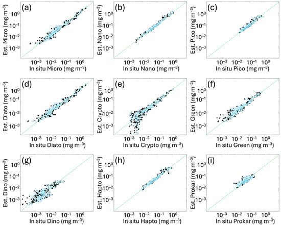 In situ hindcast evaluation and independent validation of the new algorithms obtained comparing the Chla concentration of each size class (panels (a–c)) and functional type (panels (d–i)) derived from the diagnostic pigments (as detailed in Section 2.2) with the same quantity estimated by applying the new functions to the in situ total Chla. Black and light blue dots represent calibration and validation data, respectively. The green dotted line represents the 1:1 line. For the metrics, refer to Table 3.