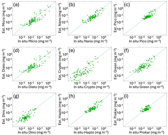 Regional satellite estimates (y axes) vs. in situ PSC and PFT Chla concentrations for the Mediterranean Sea. The panels represent the matchup validation for the following groups: (a) MICRO, (b) NANO and (c) PICO (for the PSCs), and (d) DIATO, (e) CRYPTO, (f) GREEN, (g) DINO, (h) HAPTO and (i) PROKAR (for the PFTs). Green dots represent the validation data. The 1:1 line is shown as blue dotted line. For the metrics, refer to Table 4.