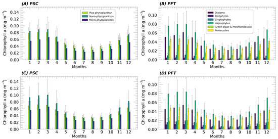 Mean monthly climatology (1998–2024) of PSC (A,C) and PFT (B,D) contribution to the total Chla (mg m−3) over the whole Mediterranean Sea. The results obtained applying the new updated algorithms (A,B) are compared with the same analysis performed, applying the previous algorithms [12] to the same satellite Chla time series (C,D).