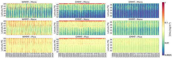 - The last transect (EMMT), which crosses the eastern Mediterranean Sea latitudinally (Figure 7, right panel), is characterized by the lowest concentrations of Chla for all groups, with the increase in concentrations for very short periods of the year, mainly between late winter–spring, generally dominated by PICO and NANO. The highest concentrations for all groups are observed in correspondence to the Rhodes gyre (Figure 7, top panel). Here, a cyclic increase in Chla concentrations across all three size classes is observed approximately every 4–5 years, with particularly intense events in 2003, 2006 and 2007.