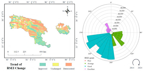 To analyze the spatiotemporal changes in the ecological quality of SNP over the past decade, a linear regression analysis of RSEI values was conducted on a per-pixel basis based on the RSEI. The resulting trend of the RSEI values is shown in Figure 4. From 2014 to 2024, the area with stable or slightly changing ecological conditions in SNP was 28,566.84 km2, accounting for 24.53% of the total area; the area with improved ecological conditions was 39,378.95 km2, accounting for 33.82%; and the area with deteriorating ecological conditions was 48,500.30 km2, accounting for 41.65% of the total area. Regions experiencing ecological degradation are distributed mainly in the northern parts of the YRSP and HRSP, while the areas of improvement are located primarily in the southern part of the HRSP and in the LRSP, which are regions with extensive grasslands and alpine grasslands.
