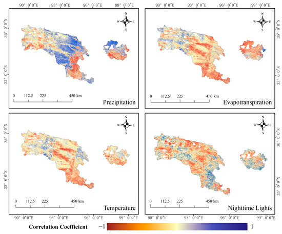 Conversely, the negative correlation between the RSEI and evapotranspiration was most pronounced in the grassland regions of the LRSP and HRSP, suggesting that these ecosystems are particularly sensitive to the local water balance. Critically, the nighttime light index showed a strong negative correlation with ecological quality, reflecting the adverse impacts of human activities and urbanization on the ecosystem’s health.