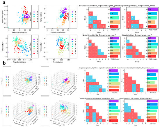 The risk detection results for the dual-factor combinations are shown in Figure 6a. By combining the category divisions from the factor discretization scatter plots with the mean RSEI values for each category in the risk detector, the following results were obtained: when precipitation was moderate (approximately 100 mm), evapotranspiration levels were high (greater than 50 mm), temperatures were elevated (above 4 °C), and nighttime light indices were low (below 0.6), then the RSEI values were high. Conversely, when the temperature was low (below 2 °C) and the nighttime light index was high (above 0.8), the RSEI values were low, indicating a greater risk to ecological quality.
